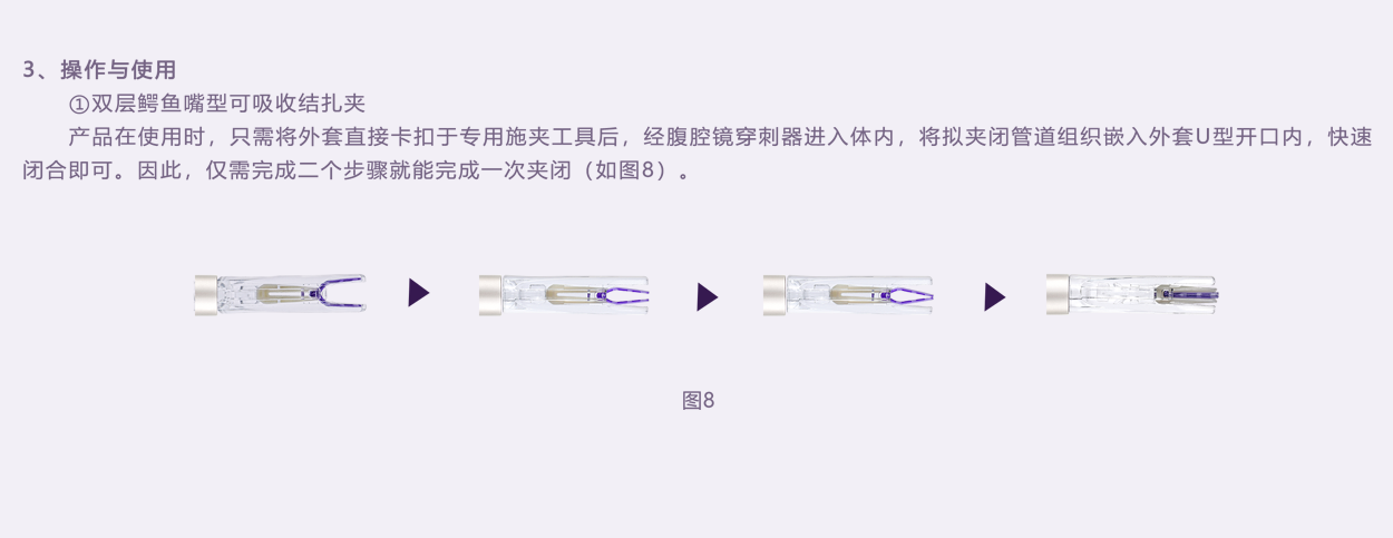 內層夾用醫用染色劑,與進口單層V型可吸收夾顏色一致,提高其可視性。