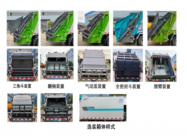 其它 | 1.專用裝置為垃圾箱體、卸料機構(gòu),主要用于收集、轉(zhuǎn)運垃圾作業(yè)功能;2.儲能裝置單體生產(chǎn)廠家/型號:力神動力電池系統(tǒng)有限公司/LP54173210-202Ah.儲能裝置總成生產(chǎn)廠家:力神動力電池系統(tǒng)有限公司;3.驅(qū)動電機類型為永磁同步電機,型號為TZ370XS-LKM1102,額定功率為80kw,峰值功率為160kw.ABS系統(tǒng)生產(chǎn)廠家/型號(西安正昌電子有限責任公司/ZQFB-V);4.側(cè)防護裝置材料為Q235,連接方式為螺栓連接.專用裝置代替后防護,離地高度為500mm;5.長度/前懸/后懸/后伸對應關(guān)系(mm):7750/1250/2300/400;7590/1250/2300/240;7570/1250/2300/220;7750/1200/2350/400;7590/1200/2350/240;7570/1200/2350/220;6.選裝直接供電式ETC車載裝置,選裝后部裝置樣式,選裝工作指示燈,僅在作業(yè)狀態(tài)下使用,行駛過程中不可點亮.選裝后部裝置及外觀樣式. | ||