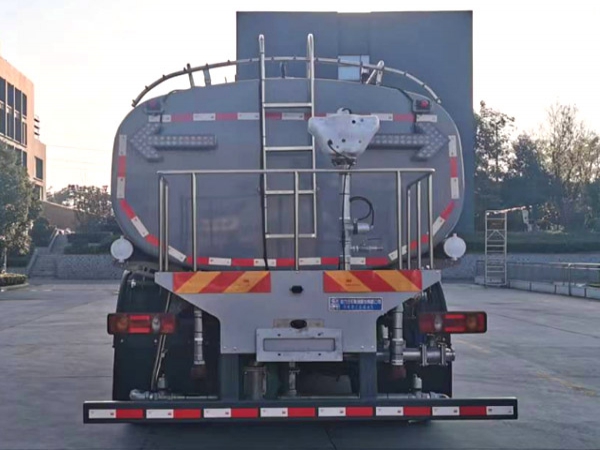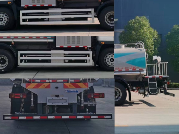 1.該車裝備有罐體,噴水架等專用作業裝置,用于實現道路的清潔、灑水作業;2.罐體總容量8.56立方米,有效容積:8.16立方米,罐體外形尺寸(長×寬×高)mm:3600×2400×1440,運輸介質:水,密度1000千克/立方米;3.儲能裝置種類/單體生產企業/總成生產企業:磷酸鐵鋰蓄電池/寧德時代新能源科技股份有限公司/寧德時代新能源科技股份有限公司;4.驅動電機類型為永磁同步電機,額定功率為105kW,峰值功率為165kW;5.ABS型號/生產企業:CM4XL-4S/4M/廣州瑞立科密汽車電子股份有限公司;6.側防護材料:鋁合金,連接方式為螺栓連接;后防護材料:Q235,連接方式:螺栓連接,后防護斷面尺寸:60×120(mm),離地高度為430mm;7.該車選用4500mm軸距,整車長度(mm)/前伸(mm)/接近角(°)對應關系:9500/1000/6,9400/900/6,9100/600/11,8500/0/11,選裝前噴水架,前置電子水炮.