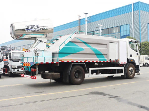 我公司抑塵車標配:前對沖、后灑、側噴、后置式工作平臺、平臺上有高壓水炮(可 360°旋轉,可調成柱狀最大射程 35 米,也可調成霧狀最大射程 15 米,(可調成: 直沖狀、大雨、中雨、小雨、毛毛雨),配備優質大功率專用灑水泵,雜物過濾網,國標通用 65 型消防接口(可通過消防栓加水),2 根引水膠管。水泵、取力器、球閥、濾網均為國家標準產品,主管道加粗,法蘭墊、法蘭盤加厚,前對沖,大通徑球閥,具有性能優良,工作可靠、效率高、流量大。尾部加裝霧炮能有效的對霧霾、灰塵進行有效的抑制效果。我公司生產的多功能抑塵車,利用水霧吸附空氣中的粉塵,淡化空氣中的污染顆粒物濃度,達到(固塵、降塵、清潔凈化空氣)的效果,有效緩解城市塵粒空氣污染現象并可用于公共場所(增濕、降溫、消毒、除臭)。可以改善空氣質量,用于降低 PM10、PM2.5,被譽為 PM2.5 治理神器。同時也可以改善工礦作業物料堆放、建筑施工和爆破拆除引起的灰塵污染,亦可用于城市大氣治理、農藥噴灑、消毒等。