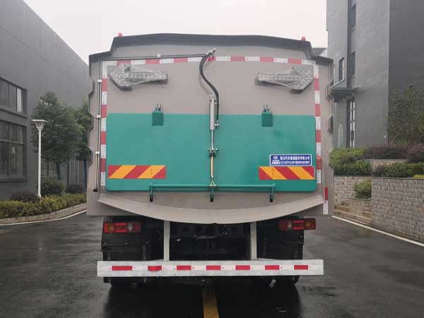 (1) 清水箱充分利用了車載空間,容積大,可達(dá)3m3。垃圾箱采用單層不銹鋼結(jié)構(gòu),傾翻卸料。