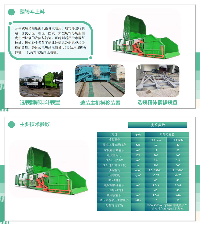 • 分體式水平壓縮垃圾站(后翻轉上料)